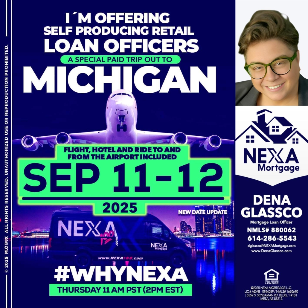 michigan sep 11-12 - Dena Glassco -Residential, Commercial, International Loan OfficerHi, my name is Dena Glassco. I’m a Loan Officer with NEXA Mortgage LLC., offering personalized mortgage solutions, fast customized quotes, great rates and service with integrity.