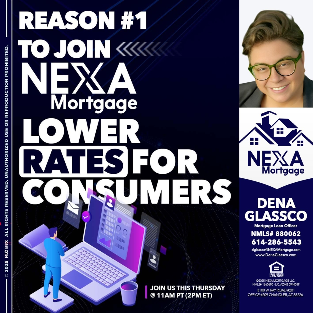 Hi, my name is Dena Glassco. I’m a Loan Officer with NEXA Mortgage LLC., offering personalized mortgage solutions, fast customized quotes, great rates and service with integrity.